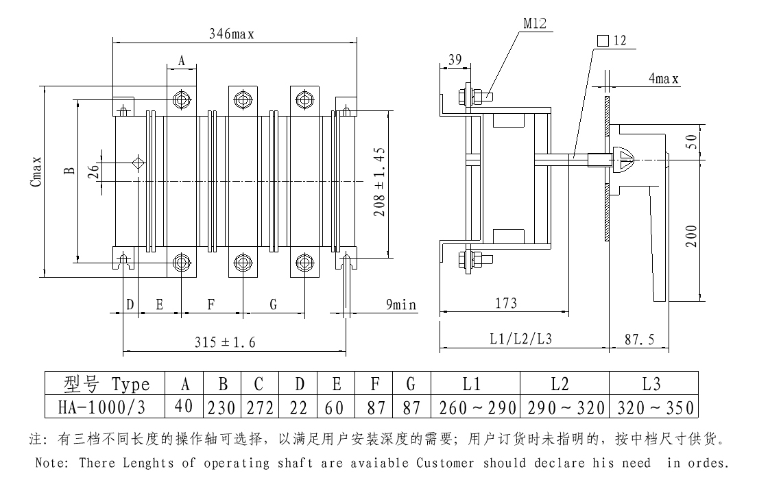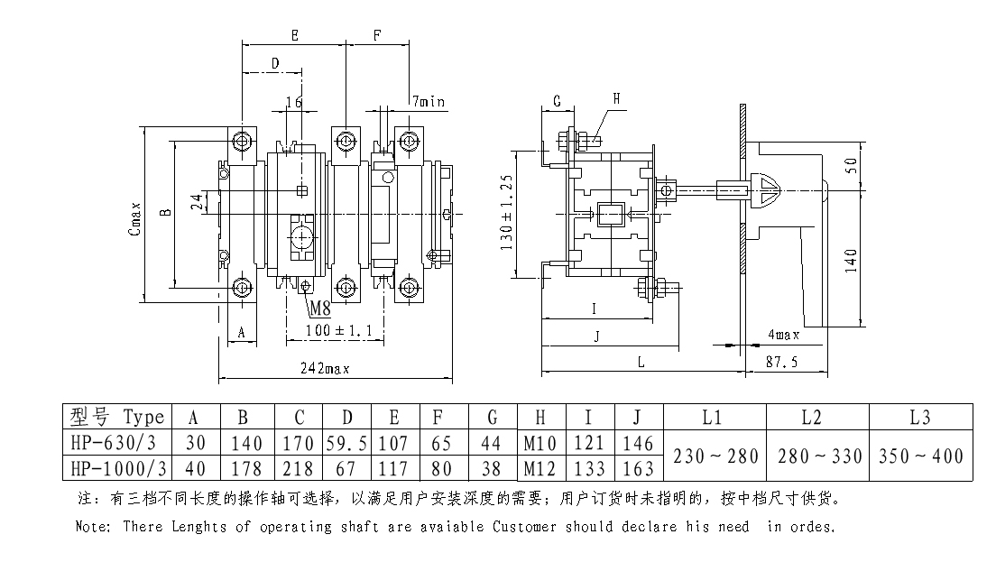 本系列隔離開關(guān)由刀型靜觸頭、滾動動觸頭及滅弧裝置組成的接觸系統(tǒng) 均組裝在由耐弧工程塑料制成的封閉底座內(nèi),能達(dá)到零飛弧。操作機(jī)構(gòu)由具有 彈簧儲能的連桿傳動機(jī)構(gòu)構(gòu)成,靠彈簧力完成開關(guān)的分、合,使開關(guān)動作無關(guān) 人力操作。手柄由操作手柄和傳動軸等構(gòu)成,屬旋轉(zhuǎn)操作方式。當(dāng)手柄旋轉(zhuǎn)操 作時,使操作機(jī)構(gòu)彈簧儲能,靠儲能的彈簧力釋放帶動動觸頭與靜觸頭形成 合、分兩種狀態(tài),從而達(dá)到開關(guān)分、合主電路的目的。